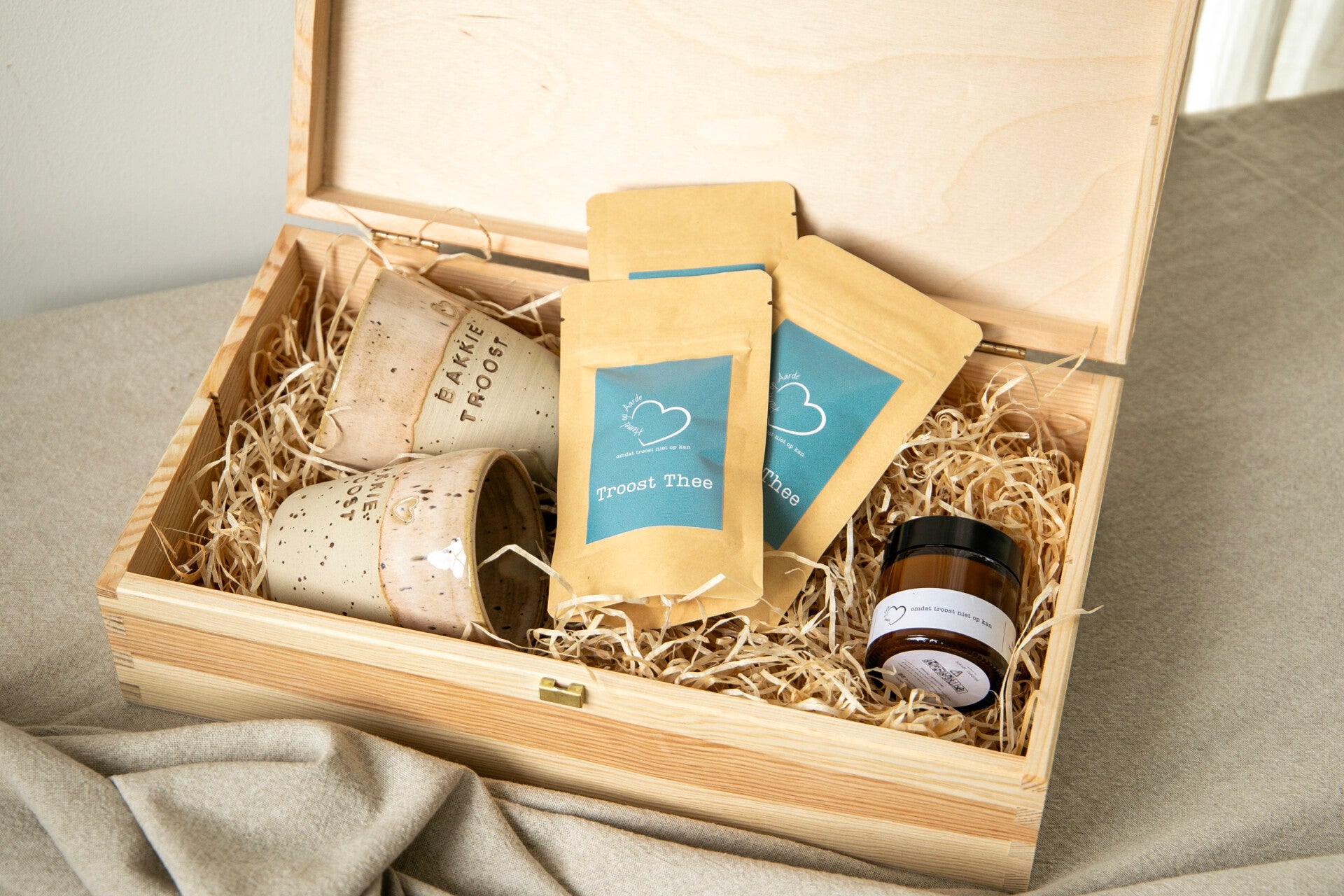 Ik zie ook hoe machteloos mensen zich soms voelen als het om verdriet gaat en niet weten hoe ze troost kunnen bieden. We zouden ervoor moeten zorgen dat het net zo normaal is om over verdriet te praten als over blijdschap. Erkenning, gezien en gehoord worden. Dit om het hartzeer te verzachten. Hoe fijn is het om te kunnen zeggen; “Ik kom zo even langs, maak jij het theewater alvast maar heet”. Jij komt een bakkie troost brengen in een prachtig houten troostkistje gevuld met unieke theemokken, heerlijke thee en een subtiel geurend kaarsje.